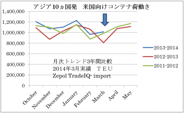 調査・データ米国調査会社のゼポ(ミネアポリス)が11日に発表した米国貿易統計分析速報によると、3月のアジア発米国向け海上コンテナ輸送実績は、アジア主要10か国発のTEUが前月から5.1%増、前年比25.2%増の100万TEUとなった。昨年3月が春節後の落ち込みが20%と大きかったこともあり、前年比で大幅に伸びた。1-3月の累計は6.3%の増加。
