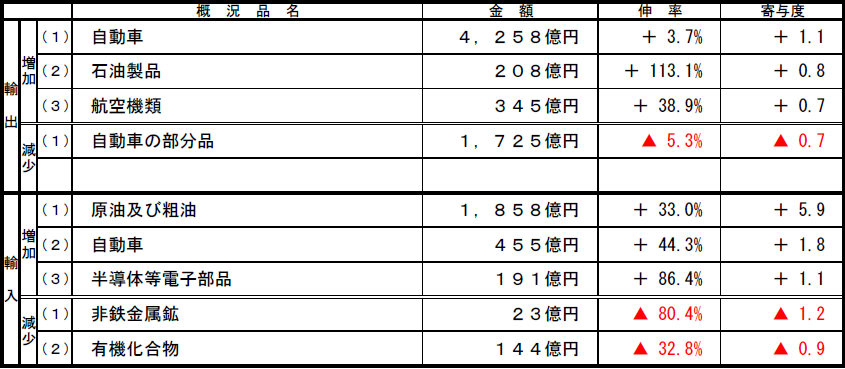 調査・データ名古屋税関は22日、3月の管内貿易状況(速報)を発表した。3月の輸出額は1兆4880億円で15か月連続の増加、輸入額は9505億円で12か月連続の増加となった。収支は5375億円の輸出超過となったが、伸び率は2か月ぶりに減少し、前年同期比20%減となった。