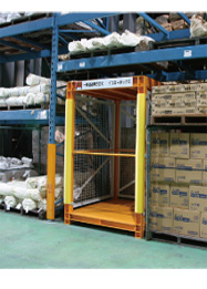イエローボックスは屋内用の簡易型一時退避ボックスで、地震発生時の構内作業員や訪問者の退避場所として使用する耐衝撃・高強度のスペースボックス。設置に必要なスペースはサポートラック1台分で、本体の上には通常のサポートラック、パレットを段積みできる。3トンのおもりを3メートルの高さから本体の天井面に落下させる衝撃試験で、ボックスの形状を維持したという。
