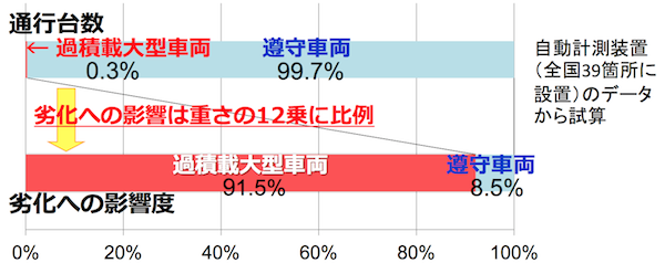 道路の老朽化対策が喫緊の課題となる中、0.3%が違法に重量を超過した大型車両が、道路橋の劣化に与えている影響は全交通の9割を占めているとして、「一部の違反車両が道路を劣化させる主要因になっている」と指摘。