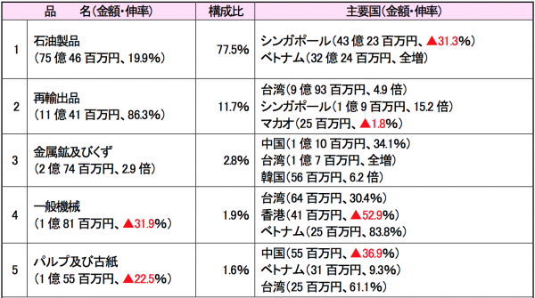 輸出は2か月連続のプラスとなる97 億円(22.1%増)、輸入は3か月連続のプラスとなる334億円(14.4%増)だった。品目別の動向と主要品目の詳細は次の通り。
