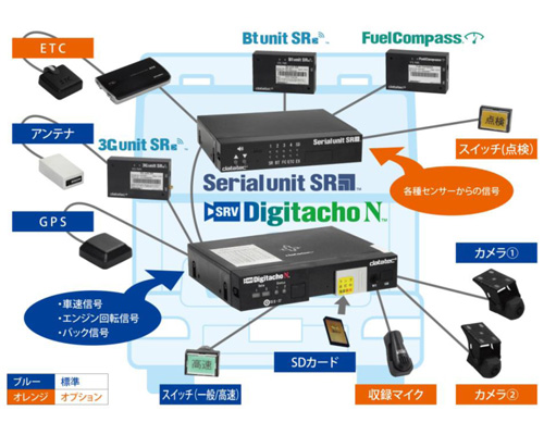 カードレス対応で、スマートフォンと連携して運行データを記録でき、燃料消費計ユニット「Fuel Compass」によって自動で燃料消費量を計測する。音声録音にも対応し、カメラ2台の映像を運行データとともに管理し、運転指導に活用できる。また、Bluetoothや3G通信を単体のユニットで提供することにより、容易に次世代通信へと交換することができるようにした。