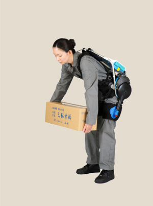アシストスーツAWN-03は体に装着して使用するロボットで、体幹の動きを位置センサーで検出し、動作意図に合わせて腰部のモータを回転させることで、荷役作業時の腰への負担を軽減する仕組み。同社は物流、ものづくり、建設・土木分野での利用を想定している。