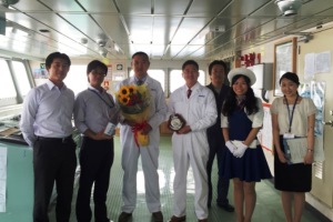 セレモニーには東京都港湾管理事務所、東京港埠頭、横浜港振興協会も参加し、船長へ記念品を寄贈した。