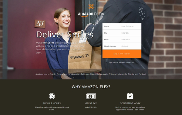 EC米アマゾンは1日、シアトル(ワシントン州)で、好きな時間に必要なだけ同社の荷物を配達できる新たな仕組み「アマゾンフレックス」(Amazon Flex)を開始した。時給は18ドルから25ドルで、この後マンハッタン、マイアミ、ダラス、オースティン、シカゴ、インディアナポリス、アトランタ、ポートランドでも開始する。