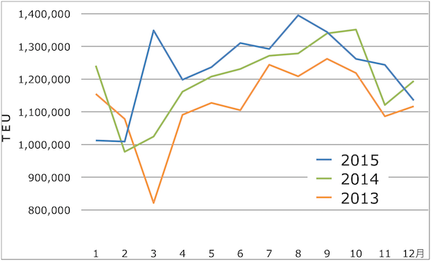 ▲アジア発米国向けのコンテナ荷動き月次トレンド比較(2015年1-12月、ゼポ調べ)