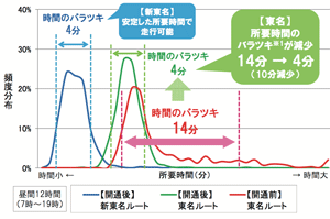 東名高速道路では、これまで1か月に24回の交通集中による渋滞が発生していたが、新東名高速道路との交通の分散効果により、この種の渋滞がゼロになり、所要時間のバラツキが減少した。