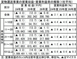 また、売上高(貨物運送事業収入)は1社平均2億79万円で、前年度からほぼ横ばいの0.8%減となった。燃料価格の下落効果で営業利益率は前年度比で1.4ポイント改善したが、黒字化には至らずマイナス0.9%と8年連続の赤字となった。