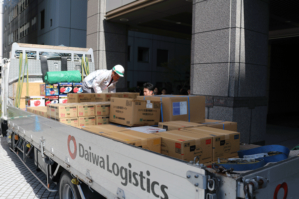 福岡支社に到着した備蓄品は後に熊本支店へ送り、顧客へ配布する。また17日15時には、大阪から福岡支社へ水1000本、アルファ米500食、カロリーメイト550箱、ビスコ20缶、簡易トイレ100個、毛布50枚、ガソリン携行缶20缶の救援物資を出荷した。