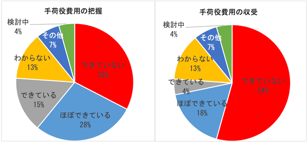 手荷役に伴う費用を把握できている事業者は「ほぼできている」を含めて43%にとどまり、「わからない」「できていない」の合計は46%となった。また、費用を収受できていると回答した事業者は「ほぼ」を含めて22%だったのに対し、「わからない」「できていない」の合計は67%と大幅に上回った。