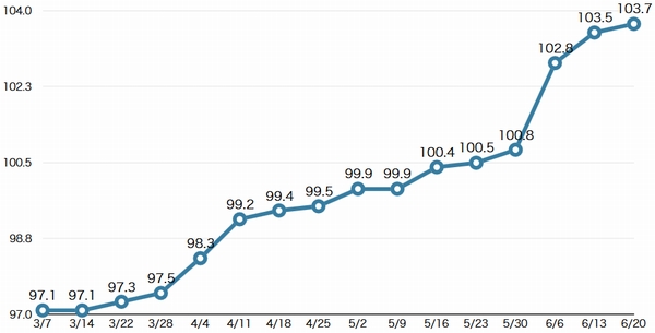 | 地域 | 6月20日(単位:円) | 6月13日(単位:円) | 上昇率 |