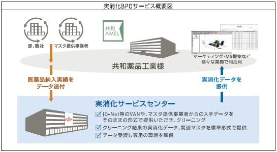 これらの課題に対し、富士通システムズ・ウエストは共和薬品工業が受信した医薬品納入実績データを自社の実消化サービスセンターで受け取り、クリーニングや関連するマスタ情報のメンテナンスなどを実施。クリーンな作業結果(実消化)データを提供する」というデータ受け渡し型の外部委託サービス(実消化BPOサービス)として、共和薬品工業のプロモーションを支援する。