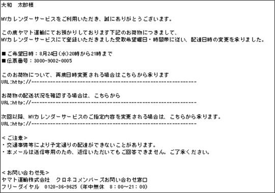 これにより利用者は、日時変更を毎回行うことなく、生活スタイルやパターンに合わせて受け取れるようになる。事前に登録した曜日・時間帯から変更したい場合には、受信したメールから都合の良い日時・場所へ変更できる。