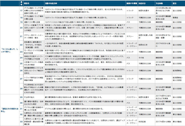 行政・団体政府は28日、自動車運送事業の働き方改革に関する関係省庁連絡会議(議長:野上浩太郎内閣官房副長官)を開き、関係省庁が「直ちに取り組む施策」として63項目をまとめた。各施策は来年度予算の概算要求に反映するとともに、制度・運用の見直しを加速し、2018年春頃をメドに行動計画を策定する。