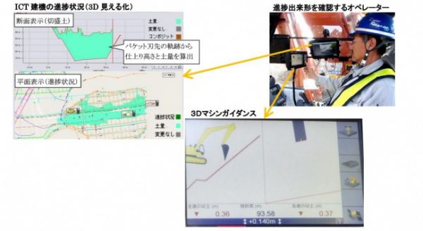 土工現場にICT(情報通信技術)を全面活用する取り組みとしては、ドローンによる三次元測量や設計データが入力されたICT建設機械の導入などがあり、作業の効率化や省人化が進みつつある。実際に測量作業では現場から丁張が無くなり、ICT建機は仕上げ工程の高精度化や熟練オペレーター不足の解消などの成果が表れ始めている。
