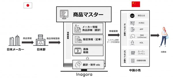 具体的には、自社が持つ4万点の日本商品の商品情報を応用し、大手流通・卸と共同で新たな商品情報を追加・更新して商品マスターに追加。これに、インアゴーラの越境ECノウハウを活かし、商品の訴求ポイントや販促情報、利用シーンなどのコンテンツを統合して、商品マスターを作成する。