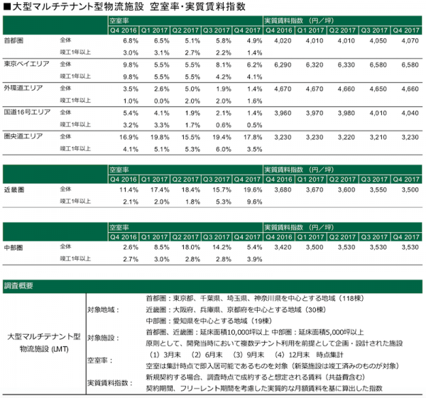 調査・データCBREが23日に発表した三大都市圏対象の2017年10-12月期のマルチテナント型物流施設市場動向によると、首都圏の空室率が4.9%に低下し、15年7-9月期以来9四半期ぶりに5%を下回ったことがわかった。