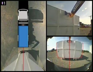同システムは、車両の左右・後方・右後方に取り付けた4つのカメラによる映像でコンテナ積み下ろし作業を支援する車載カメラシステムで、左右、後方の俯瞰映像を活用し、車両をコンテナ正面までまっすぐに後退させ、右後方のキャッチング確認用カメラ映像で、フックを掛ける際の確認ができるしくみ。