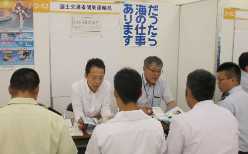 8月7日に東京流通センター第1展示場で行われた説明会には、物流、電気、医療、不動産、商社、金融、情報、サービス、建設、製造業などの分野から252社が参加。全国から任期制自衛官679人が参加し、関東運輸局のブースには面談時間の間に24人が訪れ、内航海運業の現状、船内生活、船員の処遇、海技資格の取得方法、船員のメリット・デメリットなどの説明に熱心に耳を傾けていたという。