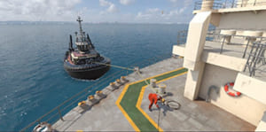 今回は「転落防止」「クレーン吊り荷落下」「火災発生時の対策」に続く4コンテンツ目として、曳船と本船をつなぐタグラインが破断して跳ね返り、乗組員の背後に強く打ち付ける事故を取り上げた。背後で発生するため、これまでの映像ツールでは説明が難しかったが、全方向に転換可能な視点と臨場感を再現するVRの特徴を活かし、教育効果の向上を図るとしている。