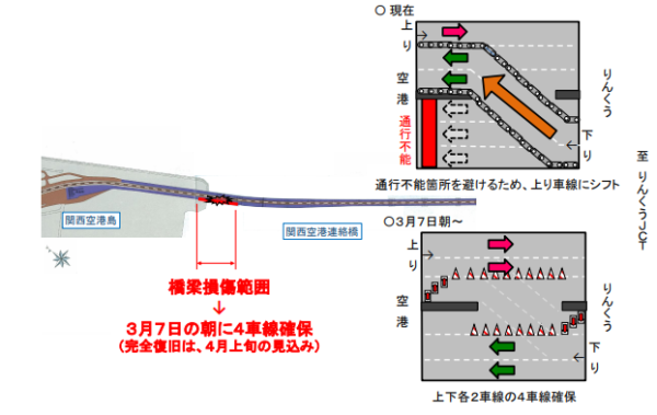 拠点・施設対面通行規制が続く関西国際空港連絡橋の復旧工事が、3月7日朝にも4車線通行を再開できる見通しとなった。国土交通省と西日本高速道路(NEXCO西日本)が26日に発表した。