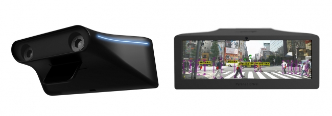 「ピレニードライブ」は、来夏発売のダッシュボード上部に設置するドライブレコーダー型のAIアシスタント機器で、本体内部にAI計算の主流となっている米・エヌヴィディア製のGPUを搭載。外向きの複眼カメラと内向きのカメラで、道路上の歩行者・自転車・自動車とドライバーの視線の動きなどを検知して危険予測を行い、音声とモニターでドライバーの運転をアシストする。