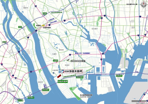 同施設は、国道23号(名四国道)「⽊曽岬インターチェンジ」(IC)から3キロ、伊勢湾岸⾃動⾞道「弥富⽊曽岬IC」から11キロ、東名阪⾃動⾞道「弥富IC」から14キロに位置する⽊曽岬⼲拓地⼯業⽤地の第⼀期分譲区域内に立地し、名古屋港鍋⽥埠頭コンテナターミナルまで13キロ、中部国際空港セントレアまで46キロ、名古屋市中⼼部まで25キロにあるため、名古屋市内の消費地だけでなく、東海全域、関⻄、関東地⽅への戦略的拠点として需要が⾒込まれる。