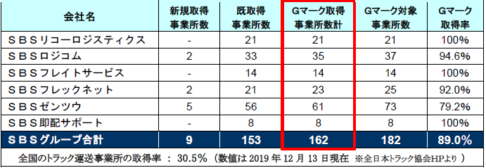 SBSホールディングスは17日、全日本トラック協会が昨年12月に実施した貨物自動車運送事業安全性評価事業(Gマーク制度)の評価で、新たに9事業所が認定を受けたことを発表した。