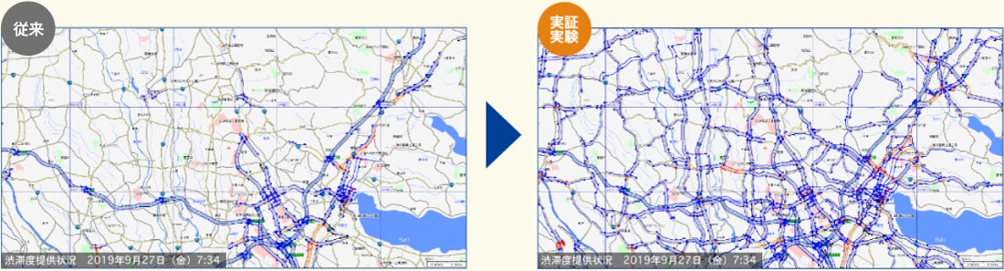 これまでは道路に設置された感知器によって交通情報を生成していたが、今回の実験では感知器を設置していない道路の情報まで配信できるようになるため、渋滞緩和や物流の効率化などが期待される。