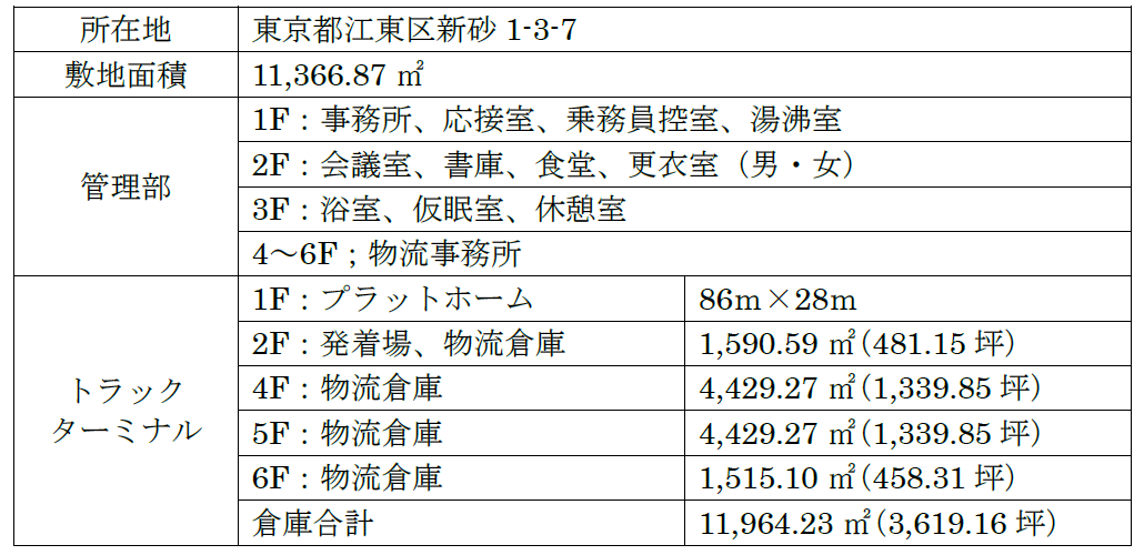 新しい建物は地上6階建てのトラックターミナル兼事務所とする予定で、1階に86メートル×28メートルのプラットホームと事務所を設け、2・3階には会議室、食堂、浴室、発着場、倉庫などを併設、4階から6階は倉庫と事務所とする。倉庫の総面積は1万1964平方メートルとなる見込みで、旧深川支店の2486平方メートルから大幅に拡張する。