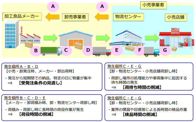 業界慣習の3分の1ルールや年月日表記された賞味期限情報、統一されていない伝票情報の手入力などにより、検品に要する時間が長くなり、トラックドライバーの労働時間が長くなる要因となっている。また、パレット化されずバラ積みとなっている商品が多く、パレット化されていてもパレットのサイズや段ボールサイズが多く存在するため、手積み・手卸しによる長時間の荷役作業が発生していることも要因の1つとなっている。