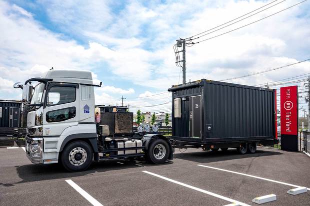 「レスキューホテル」は、平時にコンテナホテルとして運営される客室を、災害時に被災地に速やかに移設するソリューションの名称。車輪のついたシャーシ上にコンテナを配置したまま運営する「車両型」と、コンテナをシャーシから下ろし、地面に固定して運営する「建築型」があり、今回は「車両型」が東京都千代田区に輸送される。