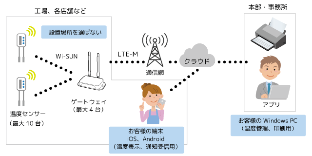 温度センサーには保管温度を計測するサーミスタ2本と室温、湿度を計測するセンサーを搭載。電池駆動、IP67防水設計で、清掃で水がかかる環境でも使用できる。ゲートウェイとは、920MHz帯を使用する無線規格で、低消費電力でありながら長距離のデータ伝送が可能な「Wi-SUN」で通信、最大10台まで接続できる。温度センサーとゲートウェイ間の通信距離は、最大数100メートル程度となる。