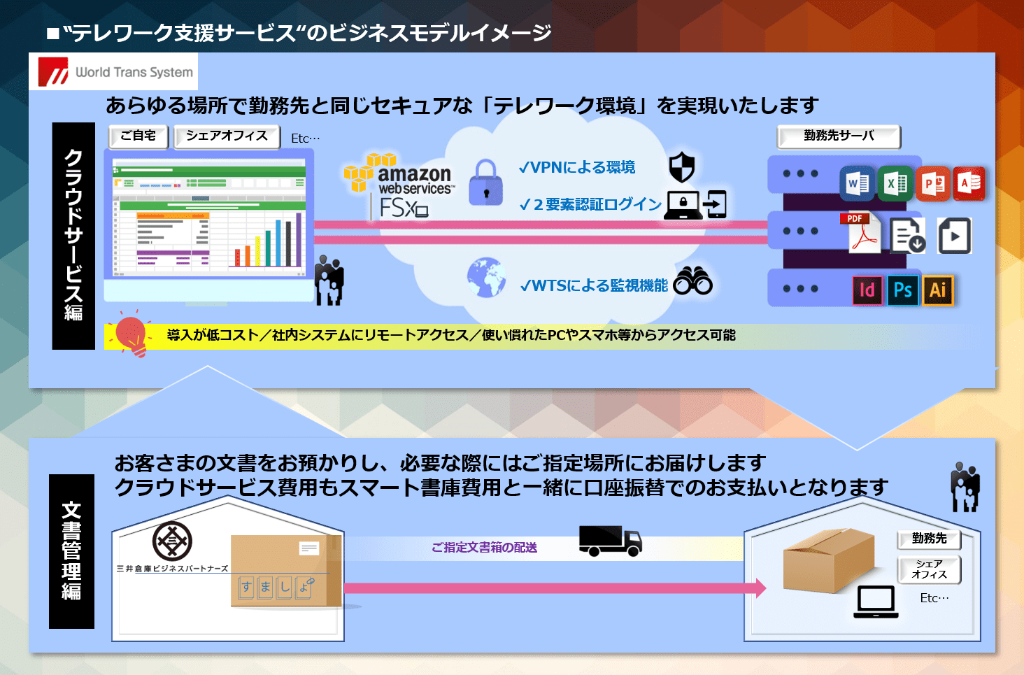 ワールドトランスシステムの「クラウドファイルサーバー構築サービス」は、アマゾンウェブサービス(AWS)を利用したもので、いつでもテレワークに対応し、自宅でも勤務先と同じ安全な就業環境を整える。
