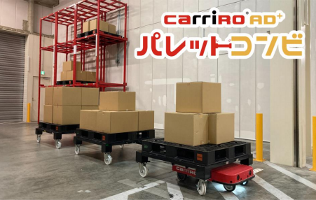 キャリロAD+パレット積載タイプは2019年12月、最大可搬重量600キロの搬送ロボットとして発売されたが、一度に複数枚のパレットを搬送したいという顧客の声に対応し、専用パレット台車を連結できるようにする「パレットコンビ」の商品名で販売することにした。