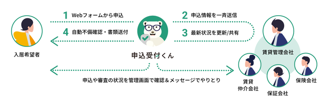 同社の受付システムは全国の賃貸管理会社1400店舗が導入しており、同システムを通じた賃貸住宅の電子申し込み数は年間20万件を超えているという。