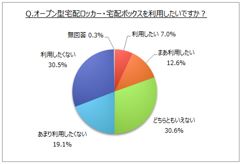 利用率の低かった「オープン型宅配ロッカー・宅配ボックスを利用したいか」を問うたところ、利用する意向を示した人が全体の2割に満たない結果となったものの、一度でも利用した経験を持つ人の8割が今後も利用したいとの意向を示した。
