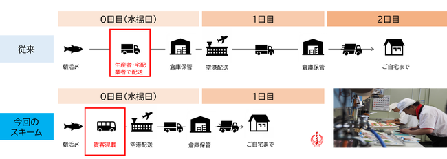 まずは鹿児島空港と阿久根・長島地区(出水)エリア間で18日から配送を開始する。朝7時2分の阿久根駅発空港行バスに生鮮品を混載し、「水揚げ翌日」には首都圏の消費者向けに鮮度の高い商品を配送する。将来的には「水揚げ当日中の配送」を目指す。