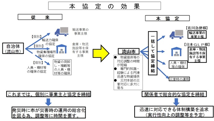 ロジスティクス千葉県流山市は、大規模災害への備えとして佐川急便、日本GLPの2社と災害協定を締結した。三者間協定として支援物資の受け入れ、配送、物資集積、搬送拠点などを取り決めた。