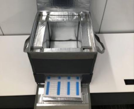 この課題に対し、作業者がドライアイスに触れることなく保冷箱から製品を出し入れできる構造を協力会社の関東商事と共同開発し、特許を出願した。
