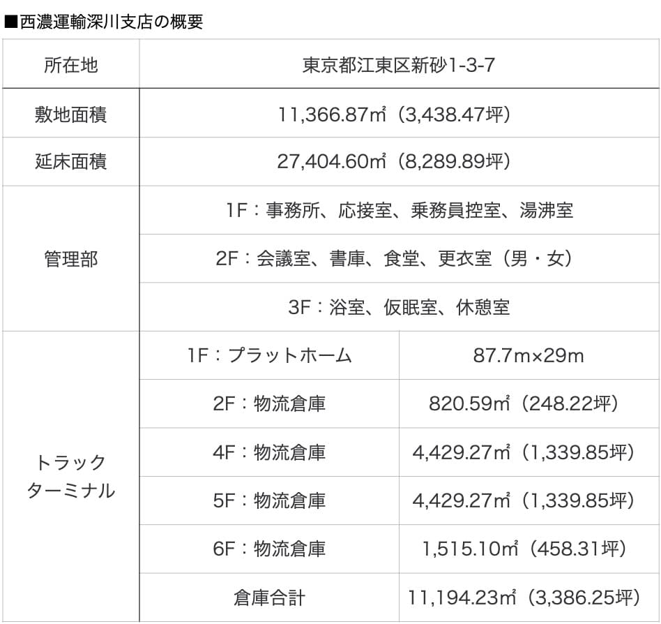 旧深川支店は1968年3月の完成以来、日本の政治経済の中心である千代田区・中央区をカバーしてきたが、周辺環境が居住地域、商業地域へと大きく変わるなか、2016年3月のセイノーロジ・トランス新木場(江東区)の完成を機に移転し、東京支店として営業を展開してきた。