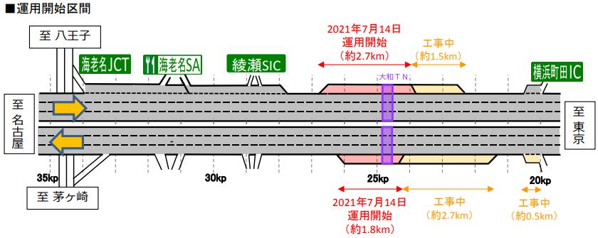 国内中日本高速道路(NEXCO中日本)は9日、東名高速道路の大和トンネル(神奈川県大和市)の拡幅工事がこのほど完成し、7月14日6時よりトンネル内を含む付加車線の運用がを開始すると発表した。