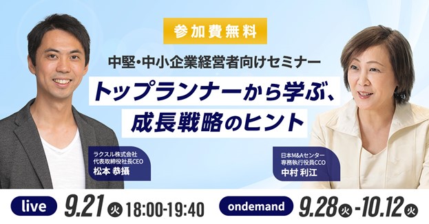 日本M&Aセンターは8日、ラクスルの松本恭攝社長兼CEO(最高経営責任者)と、宅配ポータルサイトを展開する出前館の社長を務めた日本M&Aセンターの中村利江・専務執行役員兼CCO(最高顧客責任者)による対談セミナー「トップランナーから学ぶ、成長戦略のヒント」を9月21日にオンラインで開催すると発表した。