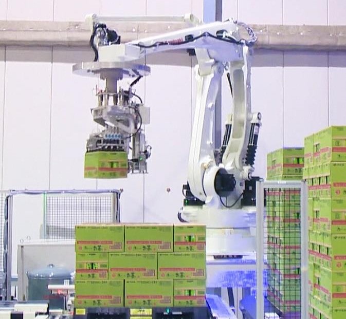 これまで手作業だった、飲料製品のパレットからパレットへのケースピッキング作業を自動化した。ホクショー(金沢市)と共同開発した新ハンド搭載の4軸ロボットと川崎重工業の3D(3次元)ビジョンカメラを組み合わせた。