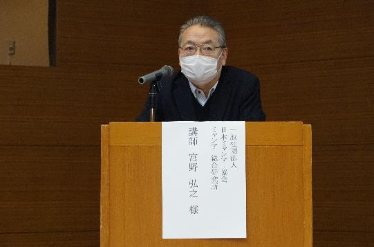 講演では、講師を務める日本ミャンマー協会の宮野弘之氏が、「ミャンマー情勢・現状と見通し」のテーマでクーデター後のミャンマーの現状と今後の見通しを解説。クーデターの経緯や現政権の閣僚・国軍の実態をはじめ、NLD(国民民主連盟)の軍への対応不足や中国との微妙な関係、米国・日本への国民感情など当地における情勢について触れた後、運送ビジネスの実態や産業動向についても紹介した。