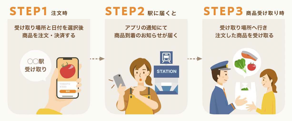 プラットフォームは、生産者や市場から産直で食材を届ける仕組み。今回のサービスは、利用者が対象商品を注文した際、受け取り場所の中から対象の駅改札を選ぶことができる。商品が駅に届くと専用アプリに通知が届き、利用者は通勤時や出掛けた帰りに注文品を受け取ることができる。利用料は無料。