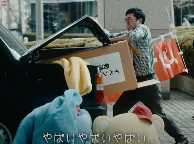 「そう、PickGo~着ぐるみ・急な配送なら編~」と題したCMは、車のトランクにイベント用の着ぐるみや荷物が押し込んでも入りきらず、「やばい!やばいやばいやばい」といった差し迫った表情をする男性のシーンから始まる。