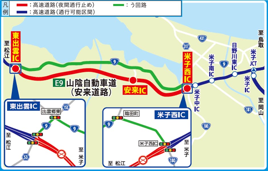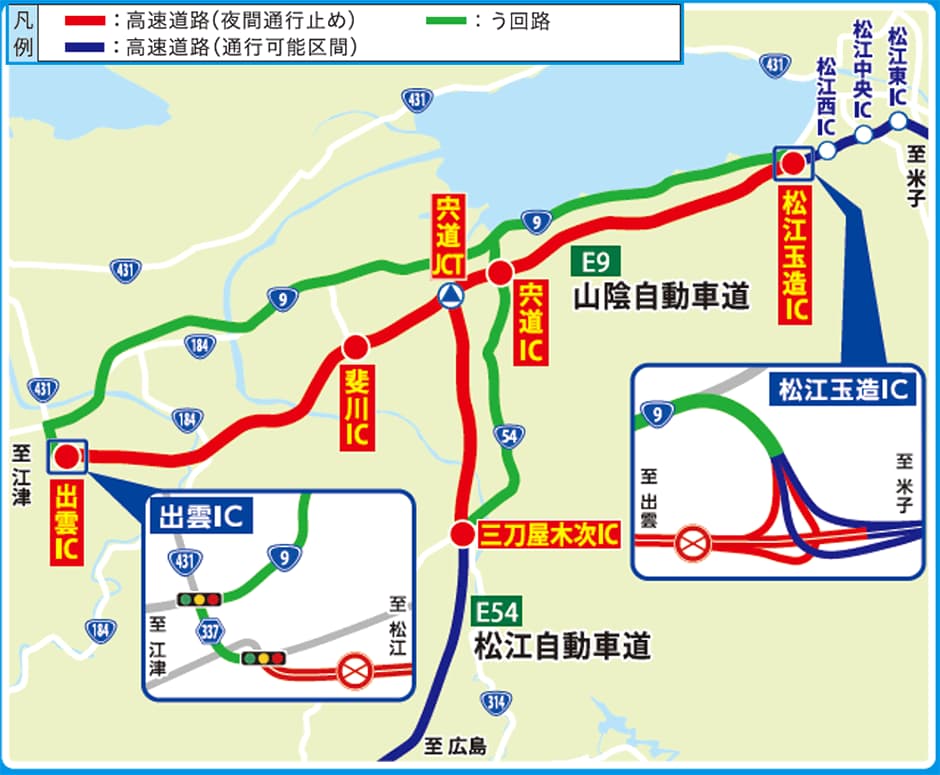 工事は期間を分けて実施する。まず山陰自動車道の松江玉造インターチェンジ(IC)・出雲IC間と、松江自動車道の三刀屋木次IC・宍道ジャンクション(JCT)間で5月18日夜から6月1日朝まで、山陰自動車道の米子西IC・東出雲IC間で6月13日夜から25日朝まで、それぞれ夜間通行止めとなる。ともに土曜と日曜を除く20時から翌日6時まで。