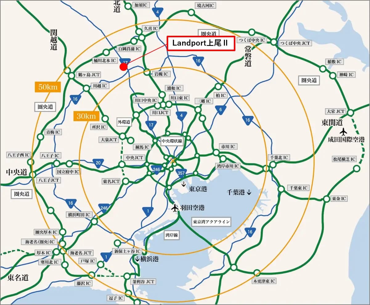 立地は、首都圏中央連絡自動車道(圏央道)「桶川北本インターチェンジ(IC)」から7キロと、都心への配送と広域配送の両方に対応する。国道16号・17号など主要幹線道路にも近接。周辺はさいたま、上尾両市の住宅街で、雇用確保の面でも優位性がある。上尾エリアでは、首都高速道路の延伸計画などもあり、輸配送の利便性が今後向上する見通しだ。近くでは、すでにLandport上尾Iも満床稼働しており、同社は2つの施設を核に関東エリアの物流ニーズに応えていく。