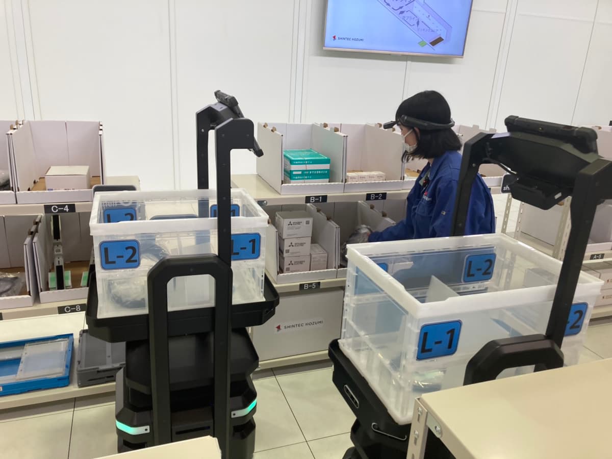 ピッキングロボットの画面に示された通りに、作業者が棚に並んでいる部品を箱に収めていく。これらの部品は、次の工程で他の部品とともに組み立てられて、一つの製品として完成していく。最後に出荷スペースに運ばれて、配送先へ向かうトラックに載せられていく――。